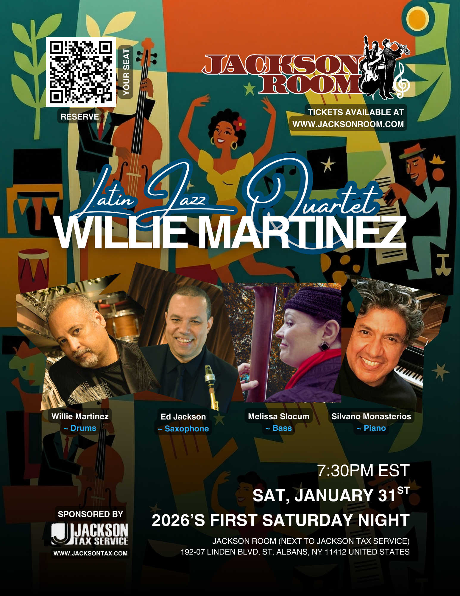 Ed Jackson on Saxophone, Melissa Slocum on Bass, Willie Martinez on Drums and Silvano Monasterios on Piano.